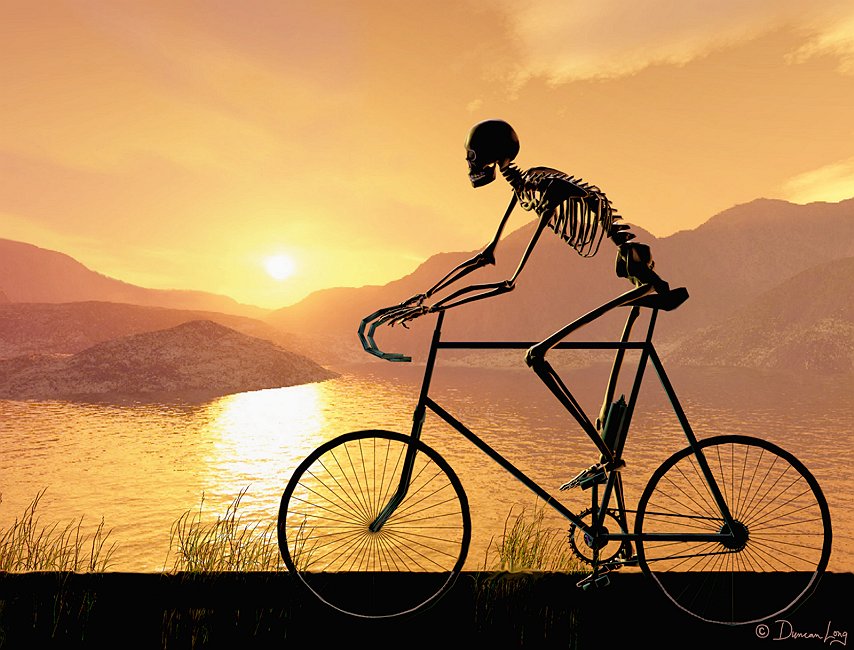 Before even beginning to write the story, I collected different forms of participation. First, I looked online for written and photographed short story prompts to generate an idea for the story—unwitting participation. The pictures used throughout the story are also forms of unwitting participation. I eventually settled on the below photo of a skeleton riding a bike and used that to fuel a short horror story (plus, it’s Halloween).